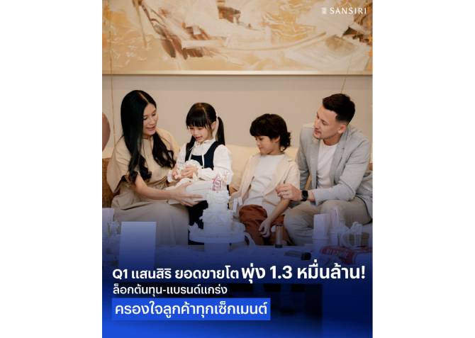 แสนสิริ ประกาศความสำเร็จเติบโตตามเป้าหมายยอดขายไตรมาส 1 ที่ 13,300 ล้านบาท คิดเป็น 28% จากเป้าทั้งปี แม้ภาพรวมตลาดอสังหาฯ จะเผชิญกับความท้าทาย กลุ่มคอนโดฯ เติบโตดี ขณะที่แนวราบเผชิญการแข่งขันสูง ชูแบรนด์แข่งแกร่ง มัดใจเรียลดีมานด์ พร้อม Backlog (ยอดขายรอโอน) สูงกว่า 24,000 ล้านบาท คาดว่ารับรู้เป็นรายได้ปีนี้ 50% ขยายการเติบโตต่อเนื่อง Q2 เปิดตัว 7 โครงการใหม่ มูลค่า 15,900 ล้านบาท ครอบคลุมทุกเซ็กเมนต์