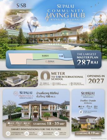 บริษัท ศุภาลัย จำกัด (มหาชน) เดินหน้ารุกตลาดที่อยู่อาศัยโซนกรุงเทพฯ ตอนเหนือ สร้างสรรค์ Community Living Hub ขนาดใหญ่ กว่า 287 ไร่ ติดถนนรังสิต-นครนายก ชูแนวคิดการพัฒนาแบบ Ecosystem ผสานโครงการที่อยู่อาศัยระดับพรีเมียมและโรงเรียนนานาชาติในพื้นที่เดียวกัน เพื่อสร้างสภาพแวดล้อมการใช้ชีวิตที่ครบวงจร พร้อมประเดิมเปิดตัว 2 โครงการใหม่ คือ ศุภาลัย พรีมา วิลล่า รังสิต คลอง 3 และศุภาลัย ปาล์มสปริงส์ รังสิต คลอง 3 มูลค่าโครงการรวมประมาณ กว่า 5,000 ล้านบาท โดยสามารถสร้างยอดขายในเฟสแรกที่เปิดขายได้แล้วกว่า 350 ล้านบาท