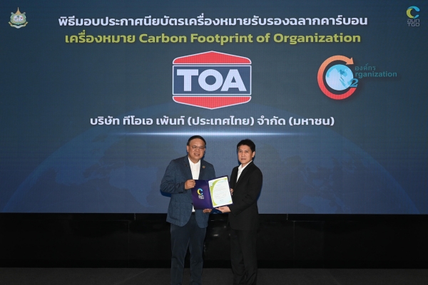 บริษัท ทีโอเอ เพ้นท์ (ประเทศไทย) จำกัด (มหาชน) หรือ TOA ผู้นำอุตสาหกรรมสีอันดับ 1 เคมีภัณฑ์ก่อสร้าง และวัสดุตกแต่งพื้นผิวของไทย ตอกย้ำความสำเร็จอย่างต่อเนื่องในการดำเนินธุรกิจควบคู่กับการดูแลสิ่งแวดล้อม เดินหน้าองค์กร Net Zero อย่างเป็นรูปธรรม ล่าสุดได้รับประกาศนียบัตร ‘การรับรองคาร์บอนฟุตพริ้นท์ขององค์กร (Carbon Footprint for Organization: CFO)’ โดยมี นายจตุภัทร์ ตั้งคารวคุณ ประธานเจ้าหน้าที่บริหาร TOA เข้ารับมอบประกาศนียบัตรจาก ดร.วิจารย์ สิมาฉายา ประธานกรรมการองค์การบริหารจัดการก๊าซเรือนกระจก (องค์การมหาชน) หรือ อบก. และมีนายณกรณ์ ตรรกวิรพัท ผู้อำนวยการ อบก. ร่วมแสดงความยินดี ณ สถาบันเพื่อการยุติธรรมแห่งประเทศไทย หรือ TIJ