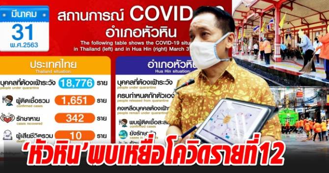 วันที่ 31 มีนาคม 63 นายแพทย์สุริยะ คูหะรัตน์ นายแพทย์สาธารณสุขจังหวัดประจวบคีรีขันธ์ เปิดเผยว่า ขณะนี้มีผู้ติดเชื้อโควิด-19 เพิ่มที่ อ.หัวหิน รายที่ 12 เป็นชายชาวอังกฤษอายุ 51 ปี เดินทางมาท่องเที่ยวที่ อ.หัวหิน หลังจากมีอาการป่วยและไปขอรับการตรวจรักษาที่โรงพยาบาลแห่งหนึ่งเมื่อวันที่ 30 มีนาคม 63 สำหรับชายชาวอังกฤษรายล่าสุดที่ตรวจพบมีประวัติเป็นเพื่อนกับผู้ป่วยติดเชื้อชาวอังกฤษรายที่ 3 ที่เดินทางมาท่องเที่ยวที่ อ.หัวหิน เมื่อวันที่ 17 มีนาคม 63 โดยสัมผัสใกล้ชิดกับผู้ป่วยรายที่ 3