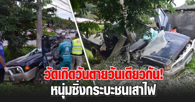 วัดเกิดวันตายวันเดียวกัน! หนุ่มซิ่งกระบะชนเสาไฟ