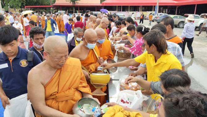 ชาวสุพรรณสวมชุดไทยทำบุญตักบาตรเทโววันออกพรรษาเนืองแน่น