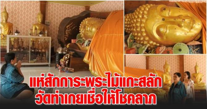 ผู้สื่อข่าวรายงานว่าที่วัดท่าเกย หมู่4 ต.ป่ากุมเกาะ อ.สวรรคโลก จ.สุโขทัย ชาวบ้านแห่กราบไหว้พระไม้แกะสลักปางปรินิพพาน ที่วัดท่าเกย เจ้าอาวาสเผยได้จ้างช่างแกะสลักจากต้นยางอายุกว่า 100 ปี ขณะแกะสลักพบผึ้งหลวงมาทำรัง ชาวบ้านเชื่อมาสักการะแล้วให้โชคลาภ