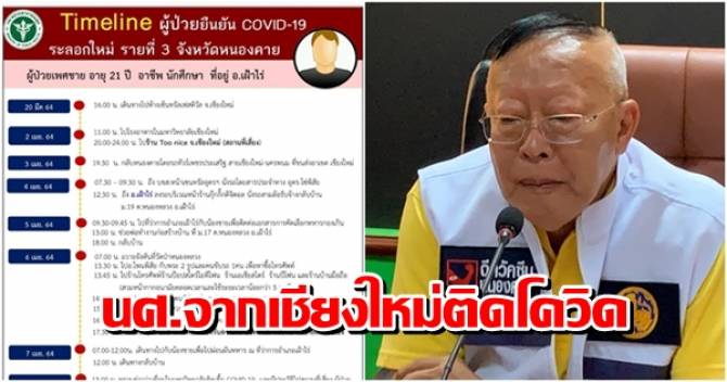 ไทม์ไลน์ของผู้ป่วยรายใหม่ที่พบ วันที่ 20 มี.ค.64 เวลา 16.00 น. เดินทางไปห้างเซ็นทรัลเฟสติวัล จ.เชียงใหม่, 2 เม.ย.64 เวลา 11.00 น. ไปโรงอาหารใน มช., 20.00-24.00 น. ไปร้านทูไนท์ จ.เชียงใหม่ (สถานที่เสี่ยง), 3 เม.ย.64 เวลา 19.30 น. เดินทางกลับหนองคายโดยรถทัวร์เพชรประเสริฐ สายเชียงใหม่ - หนองคาย ที่ขนส่งอาเขต เชียงใหม่, 4 เม.ย.64 เวลา 07.30-09.45 น. ถึง บขส.หน้าเซ็นทรัลอุดรฯ นั่งรถโดยสารประจำทาง อุดร-โซ่พิสัย, 12.30 น. ถึง อ.เฝ้าไร่ ลงรถบริเวณหน้าร้านกุ๊กกิ๊กดิจิตอล นั่งรถสามล้อรับจ้างกลับบ้าน, 5 เม.ย.64 09.30-09.45 น. ไปที่วาการอำเภอเฝ้าไร่กับน้องชายติดต่อเอกสารขอผ่อนผันเกณฑ์ทหาร, 13.00 น. ช่วยพ่อทำงานก่อสร้างบ้านที่ หมู่ 17 ต.หนองหลวง อ.เฝ้าไร่, 18.00 น. กลับบ้าน,