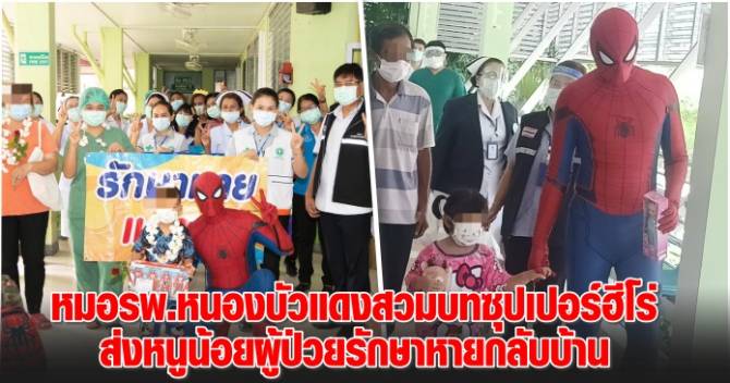 วันนี้ (7 พ.ค.2564) ผู้สื่อข่าวรายงานว่าจากกระแสโลก Online พบภาพซุปเปอร์ฮีโร่สไปเดอร์แมน เดินจูงมือผู้ป่วยโควิด-19 ที่ได้รับการรักษาหายแล้วมีหนูน้อยอายุวับ3ขวบ ทั้งชาย-หญิงขึ้นรถรับ-ส่ง ถึงอ้อมกอดผู้ปกครอง ระบุที่โรงพยาบาลหนองบัวแดง จังหวัดชัยภูมิ สร้างรอยยิ้มให้กับ ผู้ใดเห็นภาพเหล่านี้ ทั้งยังแห่ชื่นชม ถึงการทำหน้าที่ของคณะหมอและ พยาบาลเจ้าหน้าที่โรงพยาบาลหนองบัวแดงถึงความทุ่มเทที่ต้องคอยรักษาร่างกายยังไม่พอยังต้องหาแนวทางที่ช่วยรักษาทางด้านจิตใจในกระบวนการสุดท้ายอีกด้วย