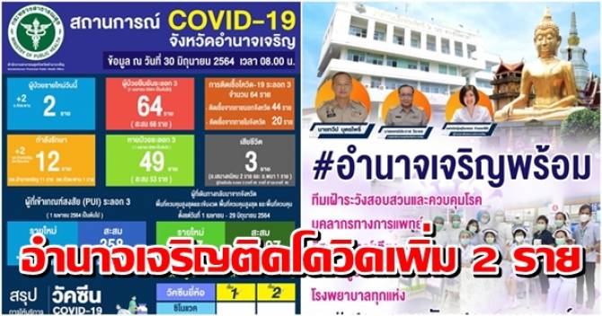 โดยมีรายละเอียด ดังนี้ ผู้ป่วยรายใหม่วันนี้ 2 ราย ( อ.หัวตะพาน 2 ราย) ผู้ป่วยยืนยันระลอก 3( 1 เมษายน 2564 เป็นต้นไป) 64 ราย(สะสม 68 ราย) กำลังรักษา 12 ราย รพ.อำนาจเจริญ 11 ราย รพ.หัวตะพาน 1 ราย หายป่วยระลอก 3( 1เมษายน 2564 เป็นต้นไป) 49 ราย (สะสม 53 ราย) เสียชีวิต 3 ราย ได้แก่ อ.เสนางคนิคม 2 ราย และ อ.พนา 1 ราย ผู้ป่วยืนยัน ระลอก 3 รายที่ 45 รายที่ 47 และรายที่ 40 ผู้เข้าเกณฑ์สงสัย(PUI) ระลอก 3 ( 1 เมษายน 2564 เป็นต้นไป) รายใหม่ 4 ราย พบเชื้อ 1 ราย ไม่พบเชื้อ 3 ราย รอผลตรวจ 0 ราย สะสม 358 ราย พบเชื้อ 32 ราย ไม่พบเชื้อ326 ราย รอผลตรวจ 0 ราย ผู้ที่เดินทางกลับมาจากจังหวัดพื้นที่ควบคุมสูงสุดและเข้มงวด พื้นที่ควบคุมสูงสุด และพื้นที่ควบคุม ตั้งแต่วันที่ 1 เมษายน – 29 มิถุนายน 2564 รายใหม่ 207 ราย สะสม 22,097 ราย