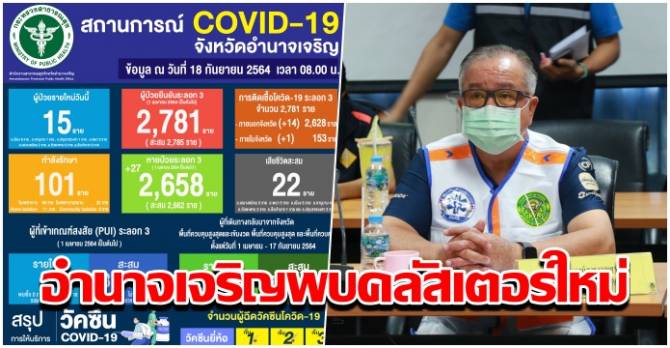 เมื่อเวลา 15.00 น.วันที่ 18 ก.ย. 64 ผู้สื่อข่าวรายงานสถานการณ์โควิด – 19 จังหวัดอำนาจเจริญว่า วันนี้( 18 ก.ย. 64) มีผู้ป่วยยืนยันรายใหม่เพิ่ม 15 ราย เป็นผู้ติดเชื้อภายนอกจังหวัด ซึ่งเดินทางกลับมาจากพื้นที่เสี่ยง และเข้ารับการรักษาที่โรงพยาบาลทันที ที่มาถึง จำนวน 14 ราย ภูมิลำเนา อ.เมืองอำนาจเจริญ 6 ราย อ.ชานุมาน 1 ราย อ.พนา 5 ราย และ อ.เสนางคนิคม 2 ราย มีผู้ติดเชื้อภายในจังหวัดเพิ่ม 1 ราย ที่หมู่ 3 ต.คำโพน อ.ปทุมราชวงศา รวมมีผู้ป่วยยืนยัน สะสม ระลอก 3 จำนวน 2,781 ราย ติดเชื้อจากภายนอกจังหวัด สะสม จำนวน 2,628 ราย ติดเชื้อภายในจังหวัด สะสม จำนวน 153 ราย กำลังรักษา 111 ราย ที่โรงพยาบาล 68 ราย โรงพยาบาลสนาม 22 ราย Home Isolstion จำนวน 11 ราย และ Community Isolation จำนวน 0 ราย หายป่วยเพิ่ม 27 ราย รวมหายป่วย ระลอก 3 จำนวน 2,658 ราย ไม่มีผู้เสียชีวิตเพิ่ม มีผู้เสียชีวิตสะสม จำนวน 22 ราย