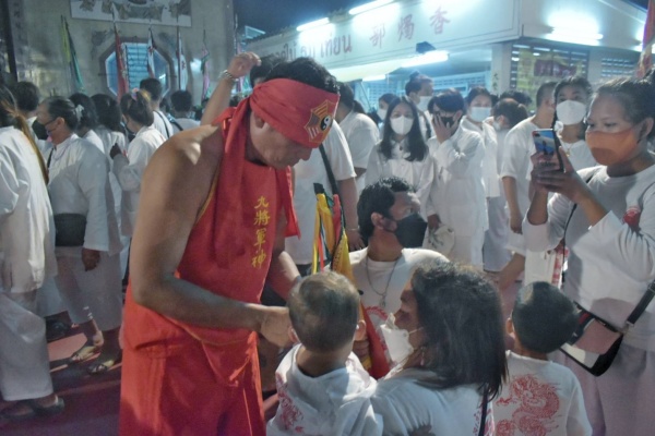 มีร่างทรง หรือม้าทรงเข้าประทับทรงประมาณ 10 องค์ และในระหว่างการประกอบพิธีบรรดาสาธุชนผู้ที่ถูกพระหรือสิ่งศักดิ์เข้าจับ จะแสดงอาการต่าง ๆ ออกมา ทั้งเสียงร้อง อาการทางกาย เมื่อสิ้นสุดพิธีก็จะถูกบรรดาสิ่งศักดิ์สิทธิ์ถอดออกจากร่าง สาธุชนเหล่านั้นก็ สลบนอนกับพื้นทั้งหญิงและชาย ซึ่งสาธุชนเหล่านั้น จะเรียกว่า ”พระช๊อต” โอกาสที่จะเป็นร่างทรง หรือม้าทรง ประมาณ 99 เปอร์เซ็นต์ในปีต่อไป
