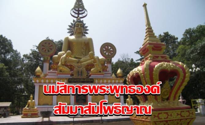 ส่วนพระพุทธองค์สัมมาสัมโพธิญาณ ประดิษฐานอยู่ภายในวัดป่าศรีสุขเกษม ตั้งตระหง่านสีเหลืออร่ามอยู่ริม ถนนสายหลัก(อรุณประเสริฐ) เป็นที่สะดุดตาผู้ที่ผ่านไปมาอย่างยิ่ง ด้วยความสูง 15 เมตร หน้าตักกว้าง 9 เมตร ลักษณะปางมารวิชัย นาถิ(ท้อง)บรรจุพระบรมสารีริกธาตุ พระสัมมาสัมพุทธเจ้า ส่วนฐานด้านล่างองค์พระ เป็นห้องโถงภายในประดิษฐานพระประธานและภาพวาดประวัติพระพุทธเจ้าที่ผนังด้านข้างพร้อมคำอธิบายพอให้เข้าใจ เห็นแล้วสวยงามมาก ซึ่งสมเด็จพระญาณสังวร สมเด็จพระสังฆราช สกลมหาสังฆปรินายก ท่านพระราชทานนามพระพุทธรูป เมื่อวันที่ 15 ก.พ. 40 และนายชวน หลีกภัย เป็นประธานในพิธีพุทธาภิเษกอย่างยิ่งใหญ่ ด้วยทุนทรัพย์จากแรงศรัทธาของชาวบ้านนาห้วยยางและบ้านใกล้เคียงร่วมกันก่อสร้างเป็นเงิน 4,999,999 บาท เพื่อเป็นสถานที่ปฏิบัติธรรมทางศาสนาและเป็นที่ยึดเหนี่ยวจิตใจรวมถึงเป็นสถานที่พักผ่อนหย่อนใจและท่องเที่ยวอีกด้วย