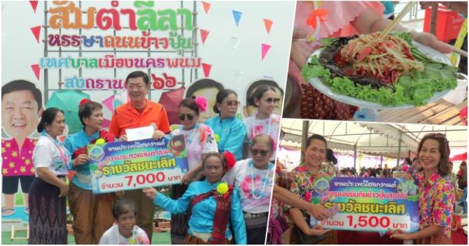 วันที่ 14 เมษายน 2566 ซึ่งเป็นวันที่สองของประเพณีสงกรานต์ จังหวัดนครพนม และ กิจกรรมส่งเสริมเทศกาลอาหารถิ่นไทนคร 9 ชนเผ่า 2 เชื้อชาติจัดขึ้นระหว่างวันที่ 13-15 เมษายน 66 โดยแบ่งโซนความสนุกหรรษาเป็น 2 โซน จุดแรกบริเวณริมแม่น้ำโขง ถนนสุนทรวิจิตร เริ่มจากลานพญาศรีสัตตนาคราช เทศบาลเมืองนครพนมจัดให้มีการประกวดส้มตำลีลา จำนวน 11 ชุมชน ซึ่งทางโรงเรียนเทศบาลทั้ง 6 แห่ง ส่งคุณครูและลูกศิษย์มาร่วมสร้างสีสันความบันเทิง ต่างแต่งชุดแฟนตาซีสีฉูดฉาดมาเต้น ประกอบเพลงจังหวะโจ๊ะๆ รวมทั้งทีมผู้แข่งขันส้มตำลีลาที่จัดชุดใหญ่ไฟกระพริบ อะไรเด็ดอะไรอร่อยใส่ครกตำๆ เพื่อให้คณะกรรมการชิมรสชาติ เพื่อตัดสินว่าชุมชนใดจะมีสูตรเด็ดถูกปากมากที่สุด ผลคะแนนจากกรมการทั้ง 6 คน ให้ชุมชนวัดสว่างสุวรรณารามคว้าแชมป์ ได้เงินรางวัลชนะเลิศ 7,000 บาท