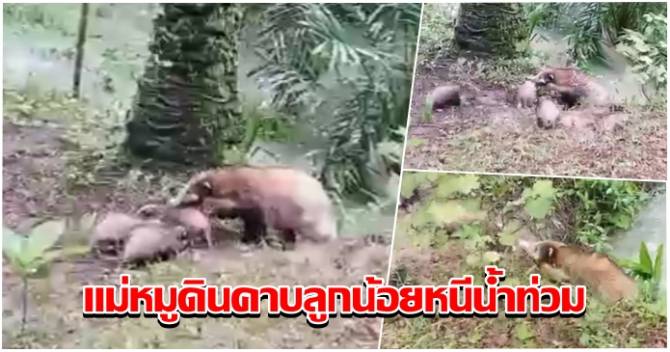 หาดูยาก! แม่หมูดินจอมอึดใช้ปากคาบพาลูกน้อย 4 ตัว หนีน้ำท่วมสุดชีวิต