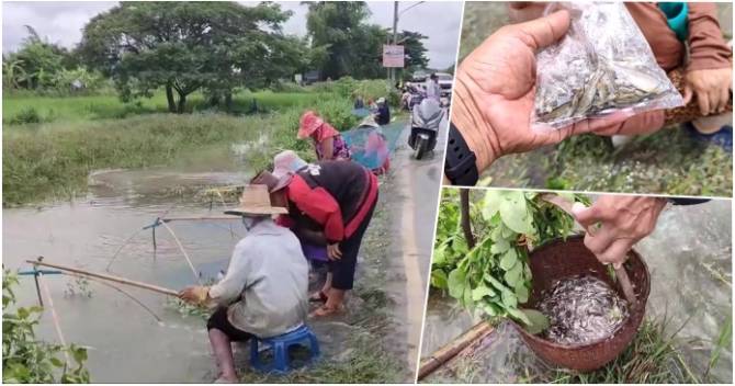 ถึงเวลานี้ ชาวบ้านที่ประสบภัยน้ำท่วม รวมถึงชาวบ้านข้างเคียงได้พลิกวิกฤติเป็นโอกาสหลั่งไหลมาเป็นขบวนมาที่จุดตรงน้ำท่วม ใช้สะดุ้ง ยกยอ และแห ออกไปจับปลาที่ไหลมากับน้ำ ทั้งนั่งทั้งยืนต่างพากันใจจดใจจ่อกับการยกยอ ซึ่งแต่ละคนต่างไม่ผิดหวังได้ปลาหลากหลายชนิดไปทำอาหารรับประทาน ไม่ว่าจะเป็นปลาซิวน้อย ปลาหมัด ปลาอีด ปลาขาวน้อย เป็นต้น