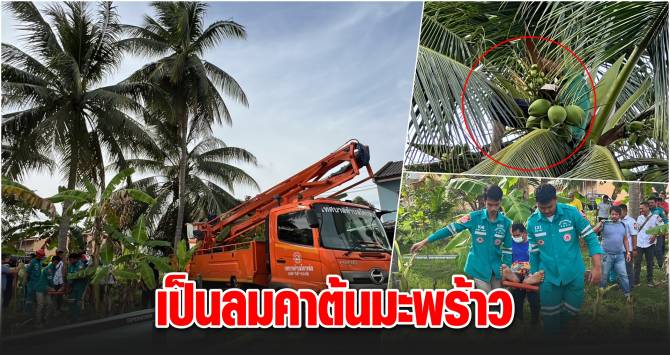 หนุ่มใหญ่เป็นลมคาต้นมะพร้าวนาน 2 ชม. กู้ภัยช่วยได้สำเร็จ