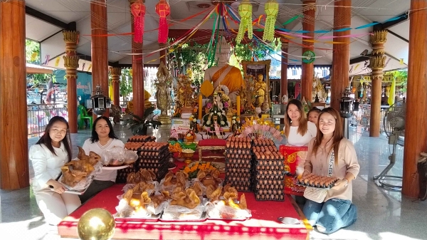 ขณะที่คุณทศพร คำสุวรรณ อายุ 36 ปี นักธุรกิจค้าขายที่ดิน อสังหาริมทรัพย์ ชาว อ.อู่ทอง จ.สุพรรณบุรี นำหัวหมู 27 หัว ไข่ไก่ 3,000 ฟอง ผ้าป่า 3 กอง มาถวายแก้บนหลวงพ่อหยกขาว และจุดประทัดแก้บน 1 หมื่นดอก หลังจากที่ได้มากราบไหว้ของพรกับหลวงพ่อหยกขาวเอาไว้ ซึ่งได้อธิฐานขอพรขอให้ธุรกิจค้าขายที่ดินประสบความสำเร็จตามที่ได้ตั้งยอดเอาไว้แล้วธุรกิจก็ประสบความสำเร็จตามที่ได้อธิฐานขอพรเอาไว้จริงๆ จึงได้นำหัวหมู่ ไข่ไก่ ผ้าป่า มาถวายแก้บนหลวงพ่อหยกขาวตามคำสัญญา