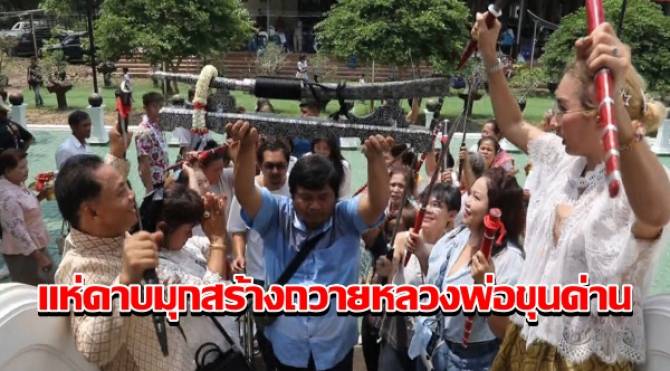 ฮือฮา! แห่ดาบมุกสร้างถวายหลวงพ่อขุนด่านราคาเกือบแสน