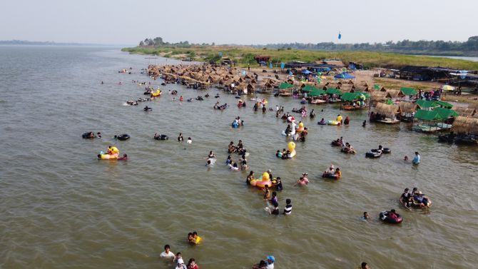 วันที่ 16 เมษายน 2567 ผู้สื่อข่าว จ.นครพนม รายงานว่า จากสภาพอากาศร้อนจัด อุณหภูมิสูงถึง 40 องศาเซลเซียส ทำให้ประชาชน นักท่องเที่ยว ส่วนใหญ่หันไปเล่นน้ำโขงคลายร้อน แทนการสาดน้ำเล่นสงกรานต์ ที่หาดแห่กลางน้ำโขง ต.น้ำก่ำ อ.ธาตุพนม จ.นครพนม จึงคึกคักไปด้วยประชาชน นักท่องเที่ยว เดินทางไปเล่นน้ำคลายร้อน ในช่วงเทศกาลสงกรานต์