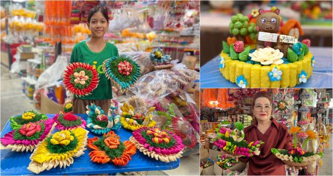 ร้านพวงมาลัยพรหมเพชรโดม่อน จำหน่ายกระทงตามทำเนียมดั้งเดิม กระทงสุโขทัย กระทงประดิษฐ์จากใบตองดอกไม้ และพืชนานาพรรณ โดยช่างฝีมือที่ชำนาญงานดอกไม้แบบไทยดั้งเดิมประสบการณ์กว่า 40 ปี เริ่มต้นที่ 200 บาท สนใจติดต่อ 081-917-4218