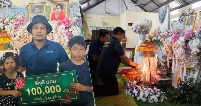 ก่อนเริ่มพิธีสวด น้องแช้มป์ ลูกชายของผู้เสียชีวิต ได้นำอาหารมื้อเย็นมาให้พ่อแม่ พร้อมเคาะโลงศพทั้งสองใบและกล่าวว่า “ลูกเอาอาหารมาให้แล้วนะ” ในขณะเดียวกัน น้องเชียร์ ลูกสาว ได้เต้นรำต่อหน้าโลงศพของพ่อและแม่ โดยบอกว่า ก่อนที่แม่จะเสีย แม่ได้สอนให้เธอเต้นรำเพื่อร่วมฉลองปีใหม่ในกิจกรรมของโรงเรียนและวันเด็กที่กำลังจะมาถึง เธอจึงอยากเต้นให้พ่อแม่ดูว่าเธอทำได้