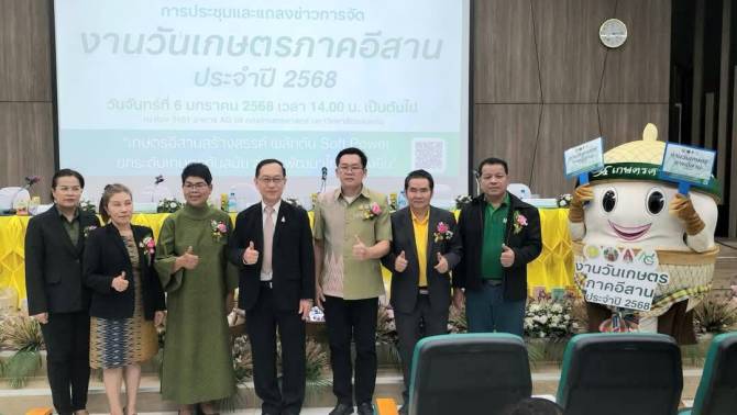 วันนี้ (6 ม.ค. 68) ที่ห้องประชุม 5101 คณะเกษตรศาสตร์ มหาวิทยาลัยชอนแก่น รองศาสตราจารย์นายแพทย์ ชาญชัย พานทองวิริยะกุล รักษาการแทนอธิการบดีมหาวิทยาลัยขอนแก่น พร้อมด้วยรองศาสตราจารย์ ดร.ดรุณี โชติษฐยางกูร คณบดีคณะเกษตรศาสตร์, นายสิทธิพงศ์ ศรีสว่างวงศ์ ผู้อำนวยการศูนย์วิจัยและพัฒนาเมล็ดพันธุ์พืชขอนแก่น, นายกมล โสพัฒน์ ผู้อำนวยการสำนักงานส่งเสริมและพัฒนาการเกษตรที่ 4 จังหวัดขอนแก่น, นายอิทธิพัทธ์ จำรัสบุญหิรัญ ผอ.ส่วนส่งเสริมและพัฒนาการปศุสัตว์, นางปราณี สีหบัณฑ์ ผู้เชี่ยวชาญด้านวางระบบการพัฒนาที่ดิน กรมพัฒนาที่ดิน, นางสาวสุดคนึง พื่มชัย ผู้อำนวยการศูนย์เมล็ดพันธุ์ข้าว และนายสิทธิพงศ์ ศรีสว่างวงศ์ผู้อำนวยการศูนย์วิจัยและพัฒนาเมล็ดพันธุ์พืชขอนแก่น ร่วมแถลงข่าวงานเกษตรภาคอีสาน ประจำปี 2568 ภายใต้แนวคิด "วิชาการเกษตรสร้างสรรค์ ผลักดันคุณภาพผลผลิต ด้วยเกษตรทันสมัย นำอีสานเข้าสู่ศูนย์กลางเมล็ดพันธุ์พืชเขตร้อน"