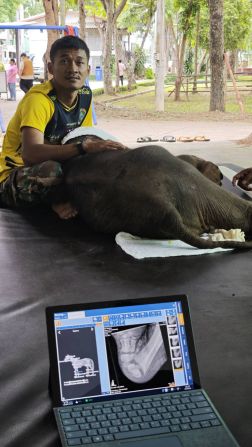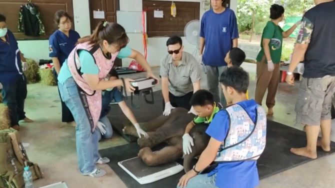 ทีมสัตวแพทย์จากหลายหน่วยงาน รวมทั้งสำนักบริหารพื้นที่อนุรักษ์ที่ 3 (บ้านโป่ง) และมหาวิทยาลัยเกษตรศาสตร์ วิทยาเขตกำแพงแสน ได้นำเครื่องเอกซเรย์และอุปกรณ์การแพทย์เข้าตรวจอาการอย่างละเอียด พบว่ามีรอยช้ำบริเวณสันหลังและข้อเท้าหน้า รวมถึงลักษณะผิดปกติของฝ่าเท้าและเอ็นข้อที่อาจเกิดตั้งแต่กำเนิด ทำให้ไม่สามารถยืนได้เหมือนลูกช้างทั่วไป