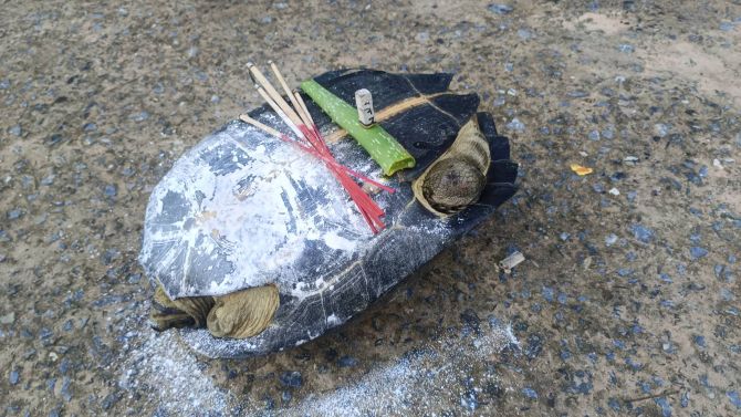 สิ่งที่แปลกคือ เต่าตัวนี้เดินเข้าหาตนโดยไม่กลัว จะถูกทำร้าย แต่ท่าทางการเดินแปลก เดินหัวทิ่มหัวตำ เมื่อส่องไฟดูใกล้ๆ พบว่าเต่ามี 3 ขา นายธันวาจึงตัดสินใจอุ้มกลับบ้าน เพราะตั้งแต่เกิดมา 42 ปี ไม่เคยเห็นเต่าที่ใหญ่ขนาดนี้