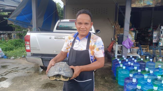 วันที่ 29 กันยายน 2568 ผู้สื่อข่าวประจำจังหวัดสุรินทร์ ได้รับแจ้งจากชาวบ้านว่าพบเต่าขนาดใหญ่ มี 3 ขา อายุน่าจะหลายสิบปี มีประชาชนเดินทางมาขอโชคขอลาภอย่างไม่ขาดสาย