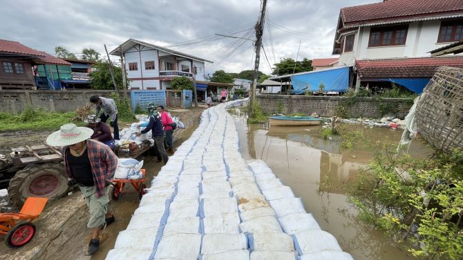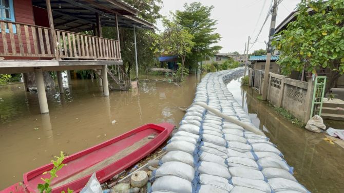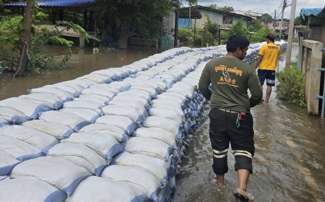 พื้นที่ ต.หาดอาษา อ.สรรพยา จ.ชัยนาท เริ่มได้รับผลกระทบ น้ำซึมผ่านแนวกั้นกระสอบทรายเข้าบ้านเรือนหลายหลัง เจ้าหน้าที่เทศบาลและชาวบ้านเร่งอุดรอยรั่วและเสริมกระสอบทรายตลอดแนวเพื่อรับมือ