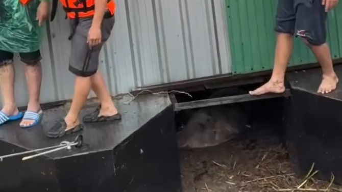 ระทึก! หมูถูกน้ำป่าพัดติดเครื่องสูบน้ำ ชาวบ้าน-เจ้าหน้าที่ระดมช่วยชีวิตสำเร็จ