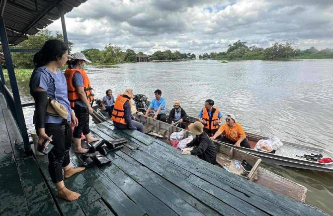 ผอ.รพ.บางเลนนำทีมลงเรือนำสิ่งของมอบให้ผู้ป่วยริมแม่น้ำท่าจีน