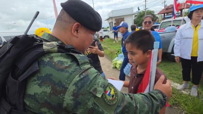 อำเภอนางรอง จ.บุรีรัมย์-รถทหารที่มุ่งหน้าไปภารกิจชายแดน ถึงกับจอดรถลงมาทักทายนักเรียนและชาวบ้านที่โบกธงชาติไทยให้กำลังใจเป็นประจำ เด็กนักเรียนแห่ขอลายเซ็น ขณะชาวบ้านและหน่วยงานรัฐนำสิ่งของเป็นกำลังใจไปชายแดน ทำทหารสุดซึ้งจนน้ำตาคลอ