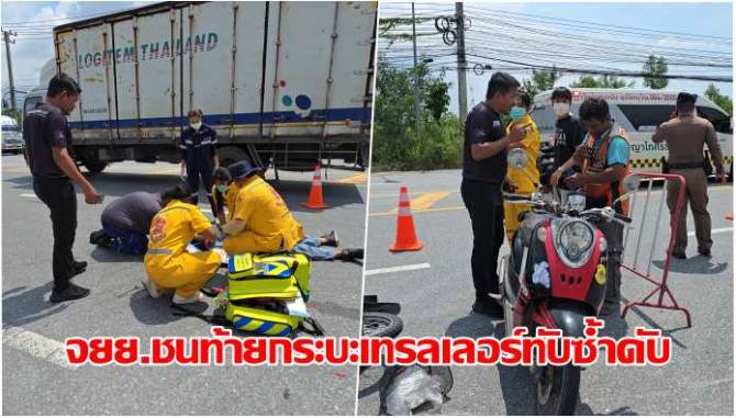หนุ่มวัยเบญจเพสขี่จยย.ไม่ทันมองกระบะถอยพุ่งชนท้ายล้มรถเทรลเลอร์ทับซ้ำดับอนาถ