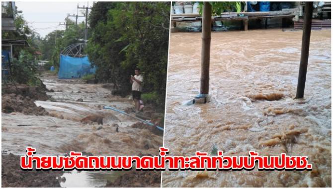น้ำยมซัดถนนเลียบแม่น้ำขาด ทะลักเข้าท่วมบ้าน ม.7 ต.ท่าทอง ต้องอาศัยอยู่บนโต๊ะในบ้าน