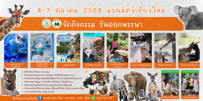 สวนสัตว์เชียงใหม่จึงขอเชิญชวนนักท่องเที่ยวและประชาชนทั่วไปมาร่วมทำบุญ สร้างสิริมงคล และเก็บเกี่ยวความสุข ความสนุกสนานตลอดช่วงวันหยุดยาวในเทศกาลออกพรรษา ระหว่างวันที่ 4 – 7 ตุลาคม 2568 ณ สวนสัตว์เชียงใหม่ สวนสัตว์แห่งความสุขของทุกชีวิตในดินแดนล้านนา สอบถามรายละเอียดเพิ่มเติม โทร. 0 5322 1179 หรือ www.chiangmai.zoothailand.org