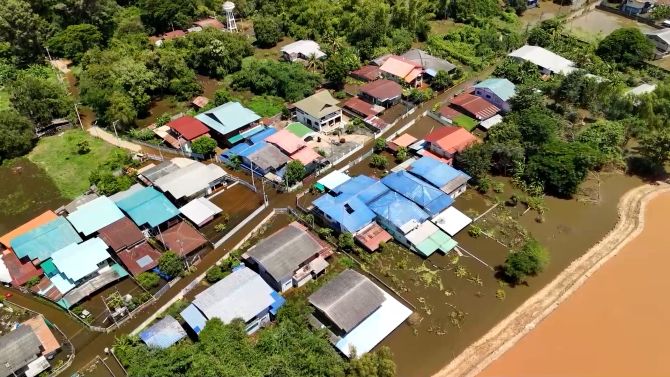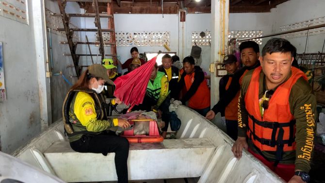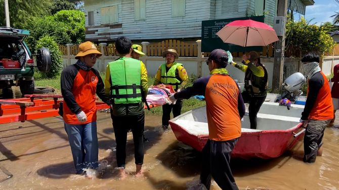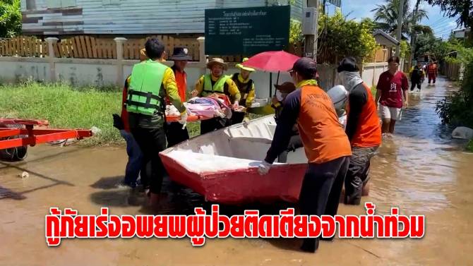 กู้ภัยเร่งอพยพผู้ป่วยติดเตียง หลังน้ำท่วมชุมชนโพนางดำออก