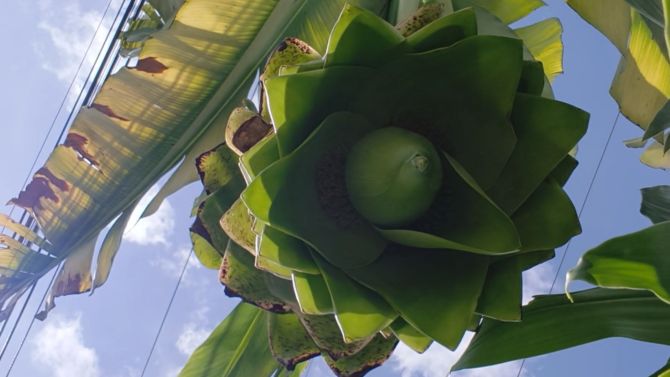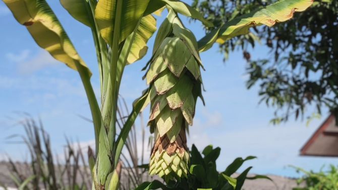 วันที่ 6 ตุลาคม 2568 ผู้สื่อข่าวรายงานว่า ชาวบ้านในพื้นที่บ้านกิ่วแก้ว ตำบลห้วยข้าวก่ำ อำเภอจุน จังหวัดพะเยา ต่างพากันฮือฮาหลังพบต้นกล้วยนวลสุดประหลาดข้างรั้วหน้าบ้านของชาวบ้าน ลักษณะปลีทอดยาวคล้ายงวงช้างห้อยลงมา โดยมีใบแหลมคล้ายใบดอกบัวปกคลุมเครือกล้วยเป็นชั้นๆ สวยงามไม่เหมือนกล้วยทั่วไป ซึ่งสร้างความสนใจให้ผู้คนในพื้นที่และใกล้เคียงที่แวะเวียนมาชมอย่างต่อเนื่อง