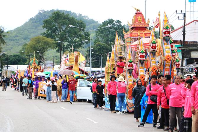 ภายในงานมีขบวนเรือพนมพระจากวัด สำนักสงฆ์และชุมชนต่าง ๆ ในพื้นที่อำเภอคุระบุรี เข้าร่วม 10 ขบวน ซึ่งเรือพระของแต่ละคัน ต่างประดับตกแต่งด้วยดอกไม้ ผลไม้และขนมต้ม ผสมผสานกับศิลปวัฒนธรรมของท้องถิ่นอย่างงดงาม ทำการผูกเชือกกับตัวเรือแล้วทำการชัก หรือ ลากไปบนถนน ที่นำด้วยขบวนฟ้อนรำ ขบวนพาเหรด และการแสดงศิลปวัฒนธรรมพื้นบ้านที่สร้างความคึกคักและสีสันให้กับงานอย่างมาก โดยขบวนเรือพนมพระจะไปจอดที่ด้านหน้าที่ว่าการอำเภอคุระบุรี เพื่อประกอบพิธีสมโภชกันในคืนนี้