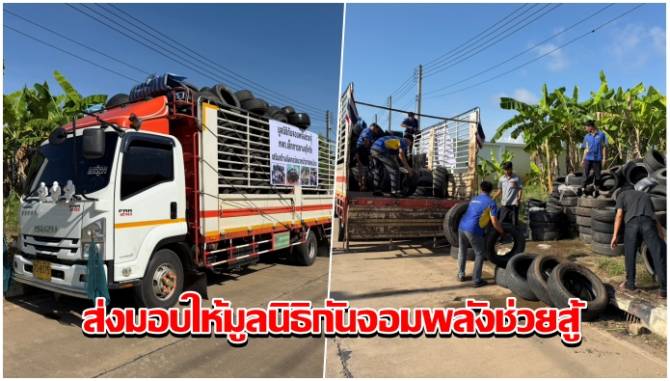 เจ้าของร้านยางสุโขทัยนำยางรถยนต์เก่าส่งมอบให้มูลนิธิกันจอมพลังช่วยสู้
