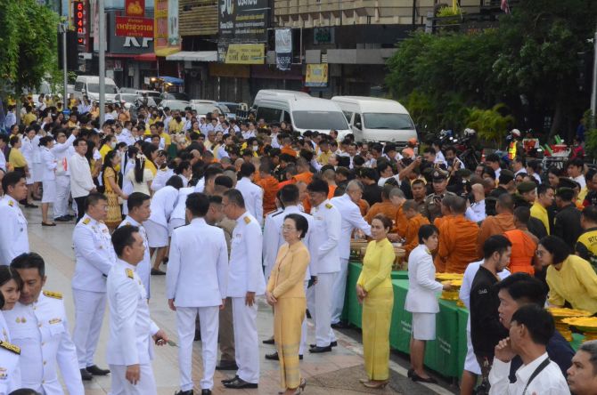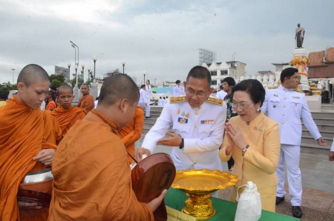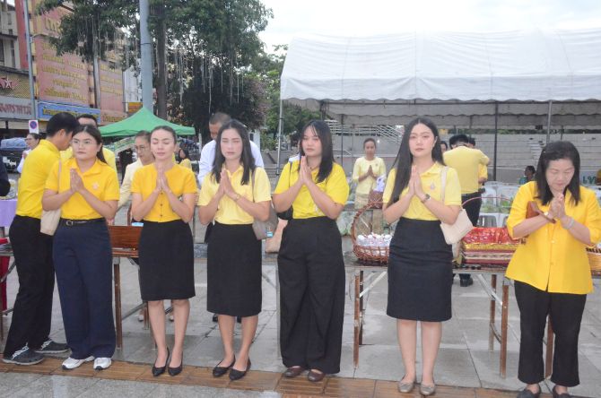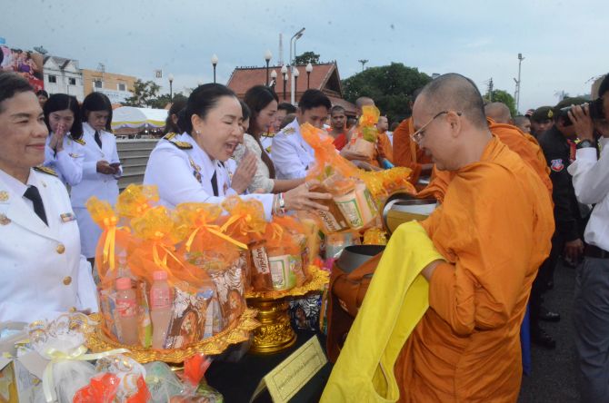 โดยมีพระเทพสีมาภรณ์ เจ้าคณะจังหวัดนครราชสีมา เป็นประธานฝ่ายสงฆ์ นำพระภิกษุและสามเณรจำนวน 89 รูปรับบิณฑบาตสิ่งของจากหัวหน้าส่วนราชการ ข้าราชการพลเรือน ตุลาการ ทหาร ตำรวจ และพี่น้องประชาชนที่มาร่วมพิธีเป็นจำนวนมาก