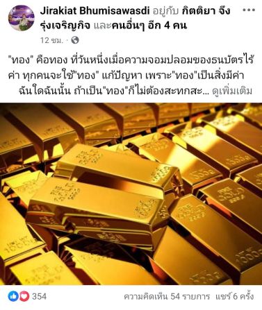 นายจีระเกียรติ ภูมิสวัสดิ์ อดีตผู้ว่าราชการจังหวัดกาญจนบุรี โพสต์ข้อความในเฟซบุ๊กหลังทราบข่าวการย้าย โดยระบุว่า “ทองคือทอง วันหนึ่งเมื่อความจอมปลอมของธนบัตรไร้ค่า ทุกคนจะใช้ทองแก้ปัญหา เพราะทองเป็นสิ่งมีค่า ฉันใดฉันนั้น หากเป็นทองจริงก็ไม่ต้องสะทกสะท้านว่าจะถูกเก็บไว้ที่ไหน”