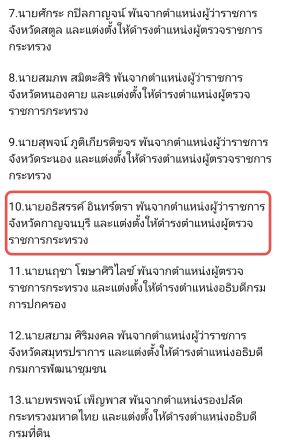 หนึ่งในรายชื่อที่ได้รับความสนใจมากที่สุดคือ นายอธิสรรค์ อินทร์ตรา ผู้ว่าราชการจังหวัดกาญจนบุรี ที่ถูกย้ายไปดำรงตำแหน่ง ผู้ตรวจราชการกระทรวงมหาดไทย ซึ่งแม้จะเป็นเพียงคำสั่งปกติทางราชการ แต่กลับสร้างแรงสะเทือนใจแก่ประชาชนชาวกาญจนบุรีจำนวนมาก เพราะตลอดเวลาที่ดำรงตำแหน่ง “ผู้ว่าฯ อธิสรรค์” ได้แสดงให้เห็นถึงบทบาทของ “ผู้นำที่ไม่เล่นการเมือง และทำงานเพื่อประชาชนอย่างแท้จริง”