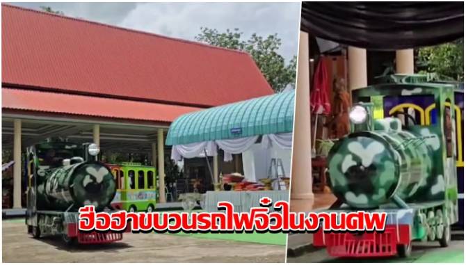 ฮือฮางานขาวดำสุดแปลก ขบวนรถไฟจิ๋วหัวรถจักรลายทหารวิ่งนำขบวนงานศพ