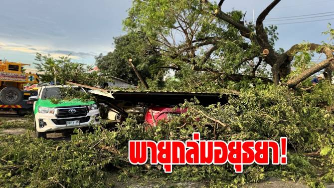 พายุถล่มอยุธยา! ต้นจามจุรียักษ์หักทับรถหน้าโรงพักวังน้อย พังยับ 12 คัน