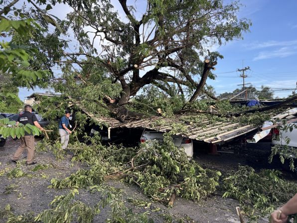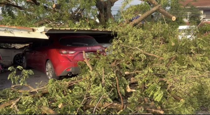 นางรัชนี อายุ 43 ปี แม่ค้าขายน้ำในบริเวณใกล้เคียง เล่าว่า ระหว่างเกิดเหตุมีฝนตกหนักและลมแรง ได้ยินเสียงสังกะสีของหลังคาโรงจอดรถหมุนดังสนั่น ก่อนเห็นต้นจามจุรีโยกแรงและล้มทับโรงจอดรถ ทำให้รถที่จอดอยู่ภายในได้รับความเสียหายหลายคัน ตนตกใจมากจนต้องวิ่งหลบเข้าร้าน และยอมรับว่ายังรู้สึกหวาดผวา เพราะไม่เคยเจอเหตุการณ์รุนแรงเช่นนี้มาก่อน