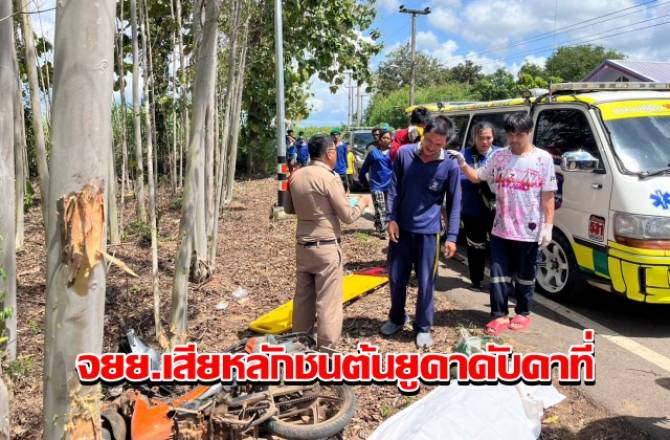 สลด! หนุ่มใหญ่ขี่จยย.เสียหลักพุ่งชนต้นยูคาลิปตัสดับสยองคาที่