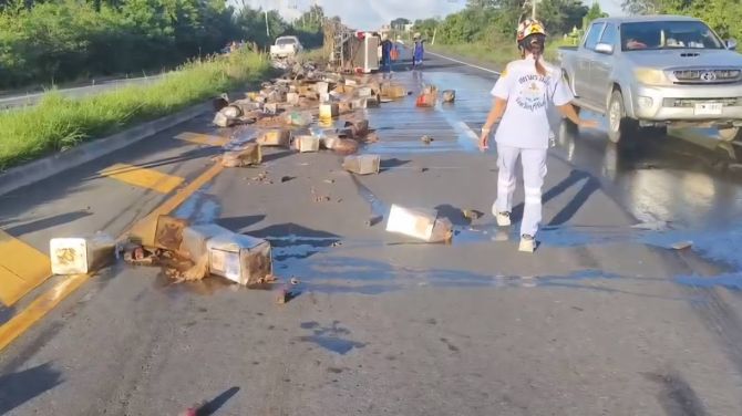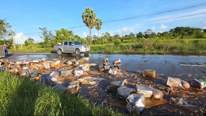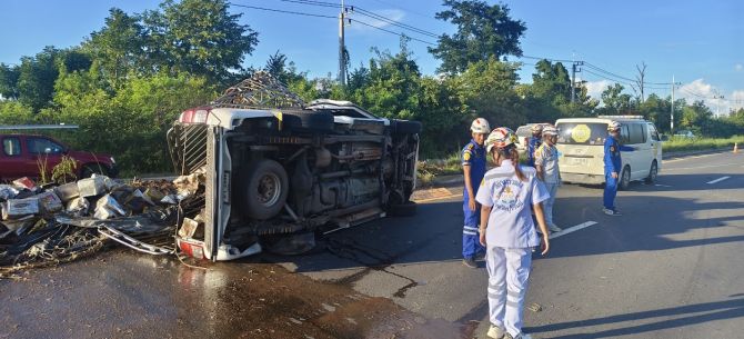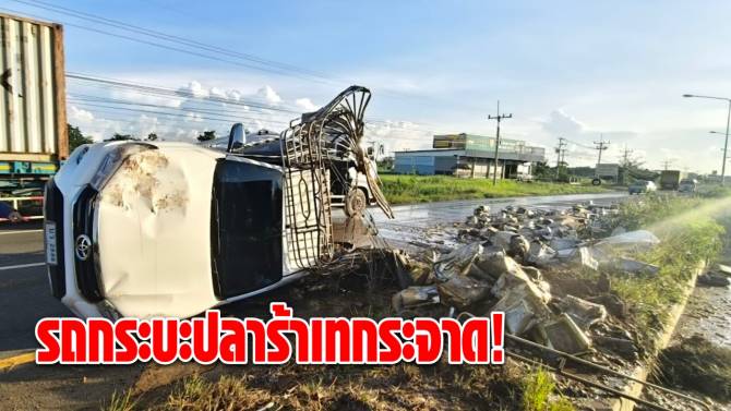 กระบะบรรทุกปลาร้ายางระเบิด! พลิกคว่ำกลางถนน กลิ่นคละคลุ้งทั่วนางรอง
