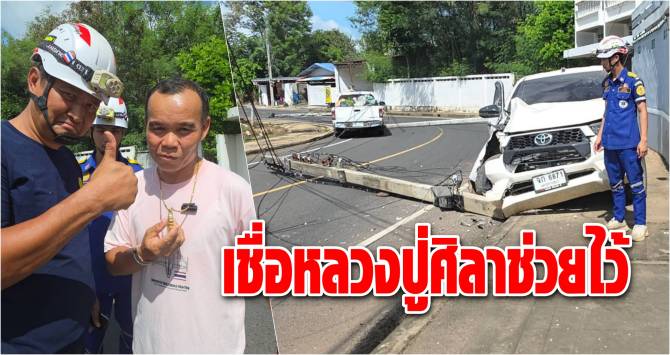 รอดปาฏิหาริย์! เสาไฟฟ้าล้มทับรถ หนุ่มกาฬสินธุ์โชว์พระหลวงปู่ศิลาเชื่อช่วยคุ้มครอง