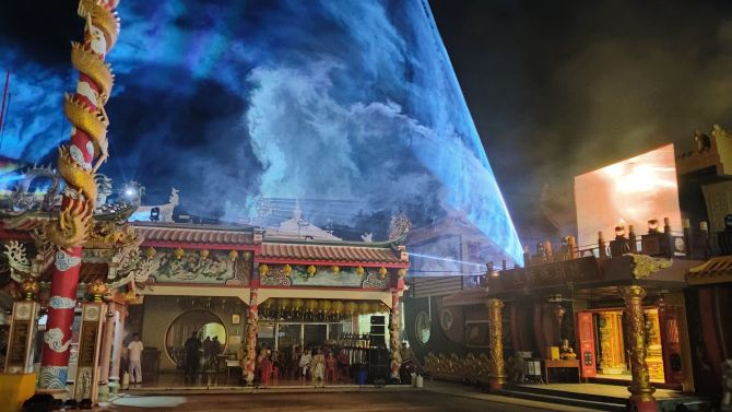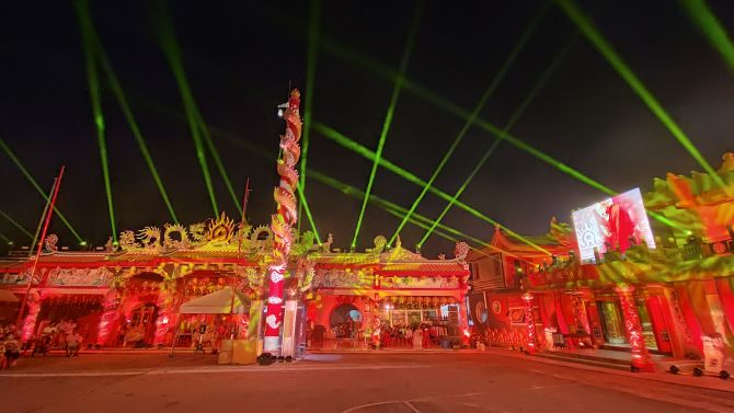 ช่วงค่ำมีการแสดงแสง สี เสียง ถ่ายทอดประวัติโรงเจเข่งซิ่วตั๋วและพระอาจารย์โหพัฒน์ ก่อนปิดท้ายด้วยการแสดงมังกรทองพ่นไฟและการปีนเสาสูง สร้างเสียงปรบมือกึกก้องทั่วบริเวณ
