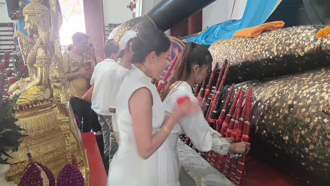 ด้านคุณรัญวรัชญ์ นนท์ธนาจิรศิริ เจ้าของร้านสปา จ.นนทบุรี เล่าว่าที่ผ่านมาได้มาอาบน้ำว่าน ที่วัดดงเสลา กลับไปแล้วโชคดี มีโชคลาภ ถูกรางวัลรับโชคมากว่า 20 ครั้งแล้ว และที่สำคัญธุรกิจ การงาน เจริญรุ่งเรือง วันนี้ได้มาร่วมงานบุญแห่กฐินดาบ ถวายดาบหลวงพ่อขุนด่าน วัดดงเสลา เป็นปีแรก รู้สึกดีใจ อิ่มบุญ ซึ่งได้เช่าดาบร่วมแห่กฐินดาบ ถวายหลวงพ่อขุนด่าน 10 เล่ม และได้ลุ้นโชค รางวัลลอตเตอรี่ที่ติดอยู่ที่ดาบ 10 ใบอีกด้วย แต่ยังไม่ขอแกะซองลอตเตอรี่ออกมาดูเลข เนื่องจากรอลุ้นตอนหวยออกงวดวันที่ 1 พ.ย.นี้ก่อน จึงจะแกะซองลอตเตอรี่ที่ติดมากับดาบออกมาลุ้นตรวจรางวัล