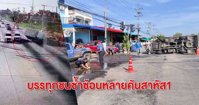 บรรทุก 4 ล้อเบรกแตก! ชนท้ายกระบะติดไฟแดง ก่อนพุ่งชนจยย.พัง 4 คัน สาหัส 1