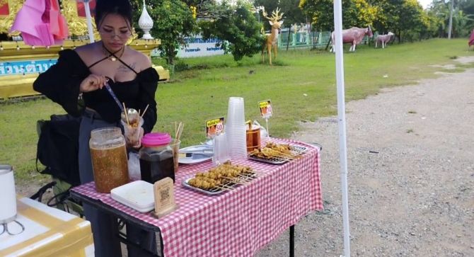 เมื่อเวลา 17.00 น. วันที่ 23 ตุลาคม 2568 ผู้สื่อข่าวรายงานว่า บริเวณริมถนนสายตำบลระบำ อำเภอลานสัก จังหวัดอุทัยธานี พบแม่ค้าสาวสวยสู้ชีวิต “น้องนุ่น” อายุ 24 ปี ชาวจังหวัดอุทัยธานี เปิดร้านขายปลาหมึกย่างไม้ละ 10 บาท พร้อมน้ำจิ้มรสเด็ด ลูกค้าแน่นไม่ขาดสาย